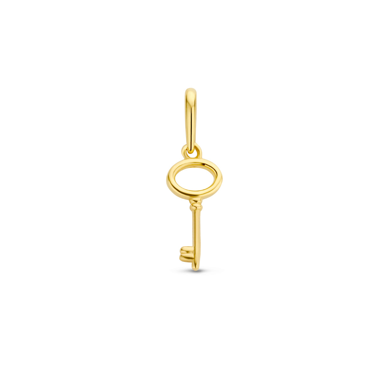 14k Geelgouden hanger in de vorm van een sleutel. De hanger heeft een totale hoogte van 1.6cm.