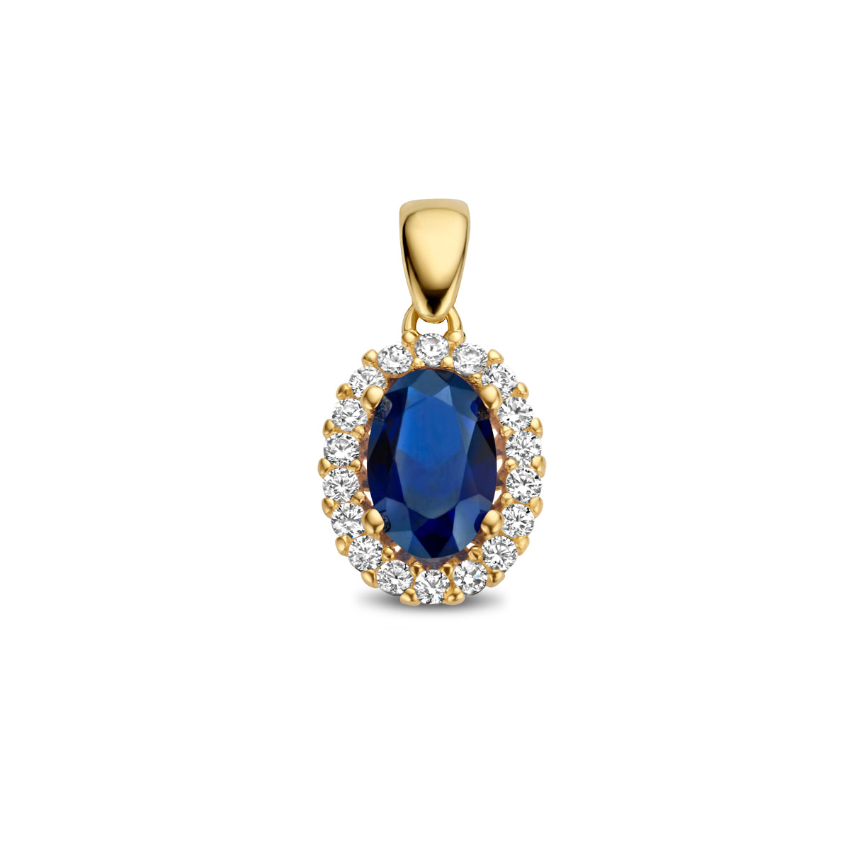 14k Geelgouden hanger uitgevoerd met schitterende synthetische saffier en zirkonia. De hanger heeft een totale hoogte van 1.3cm.