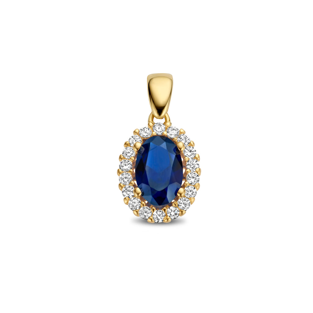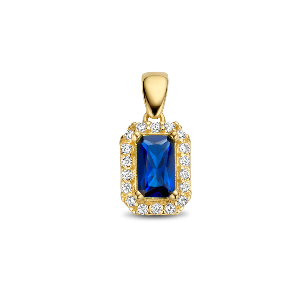 Hanger synth. saffier en zirkonia halo 14k geelgoud