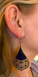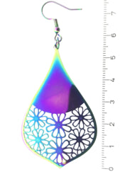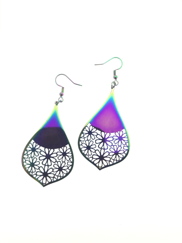 Prachtige multikleurige oorhangers met een bloemen in een druppel. De oorbellen zijn opengewerkt. Het materiaal is van chirurgisch staal.