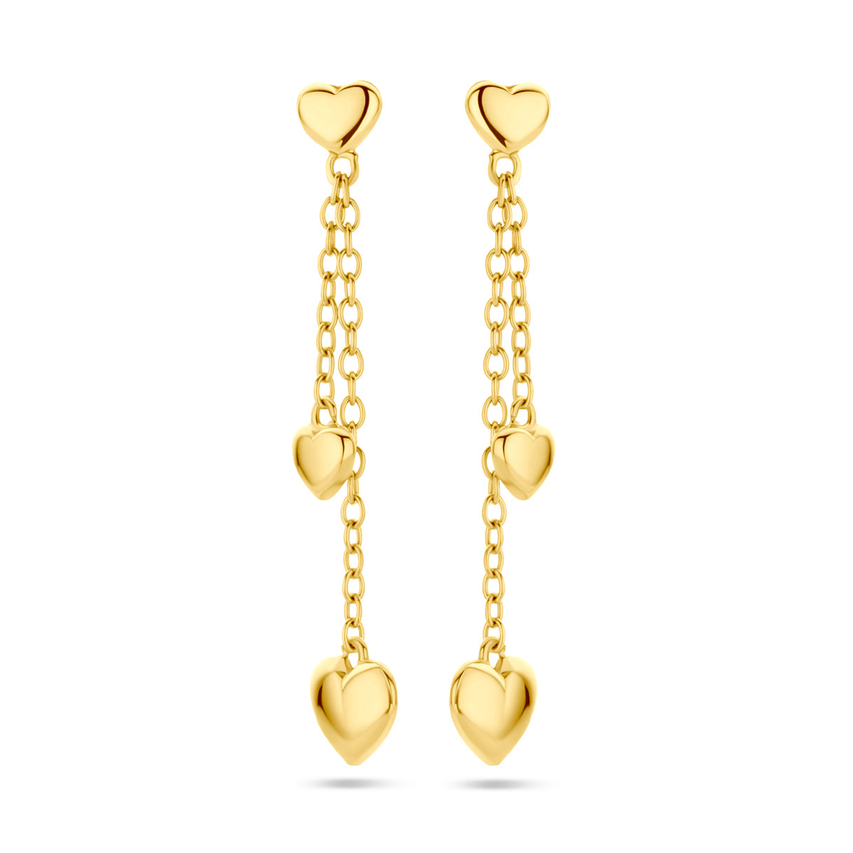 14k Geelgouden oorhangers uitgevoerd met hartjes. De oorhangers hebben een totale hoogte van 33mm.