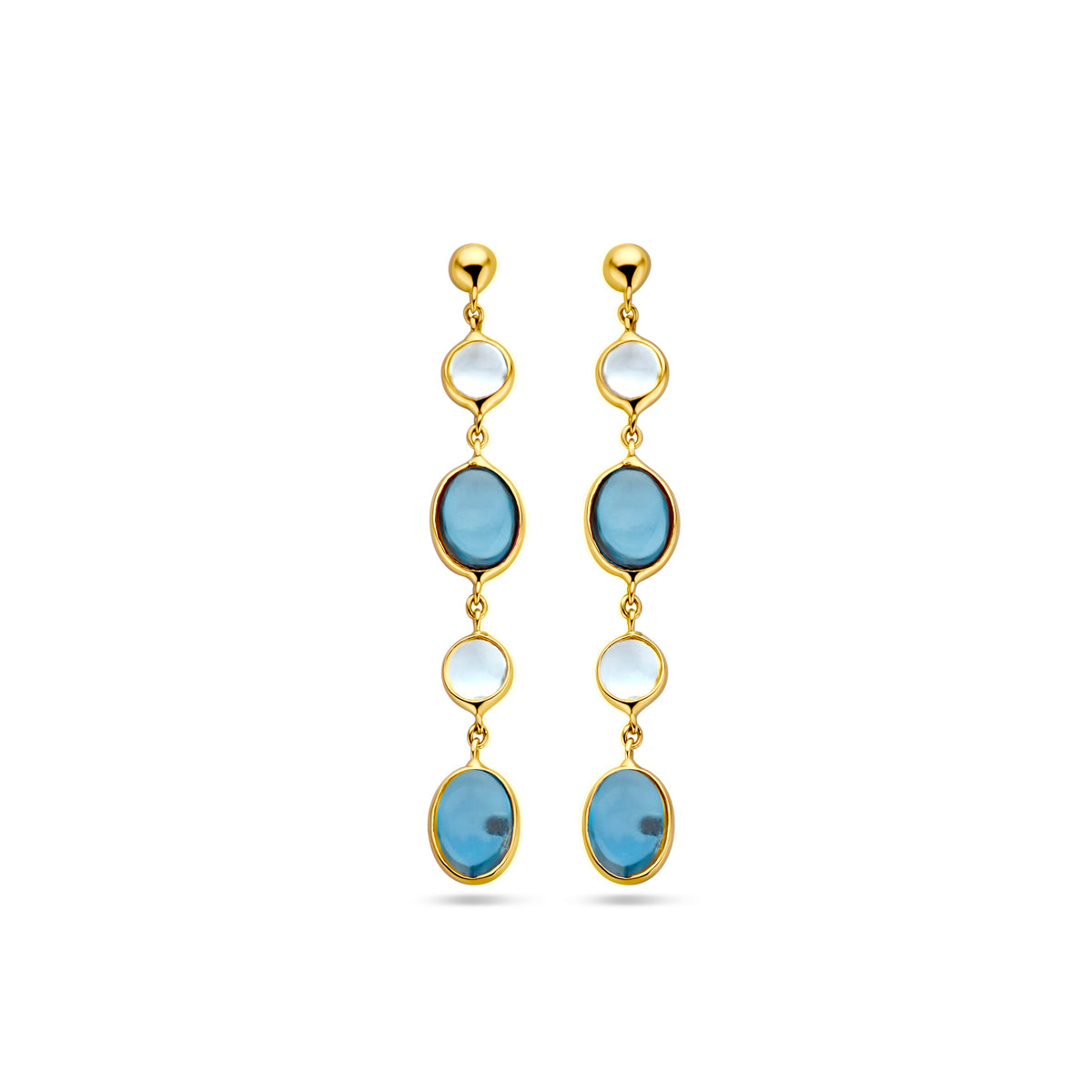 14k Geelgouden oorhangers uitgevoerd met london blue en blauw topaas. De oorhangers hebben een totale hoogte van 40mm.