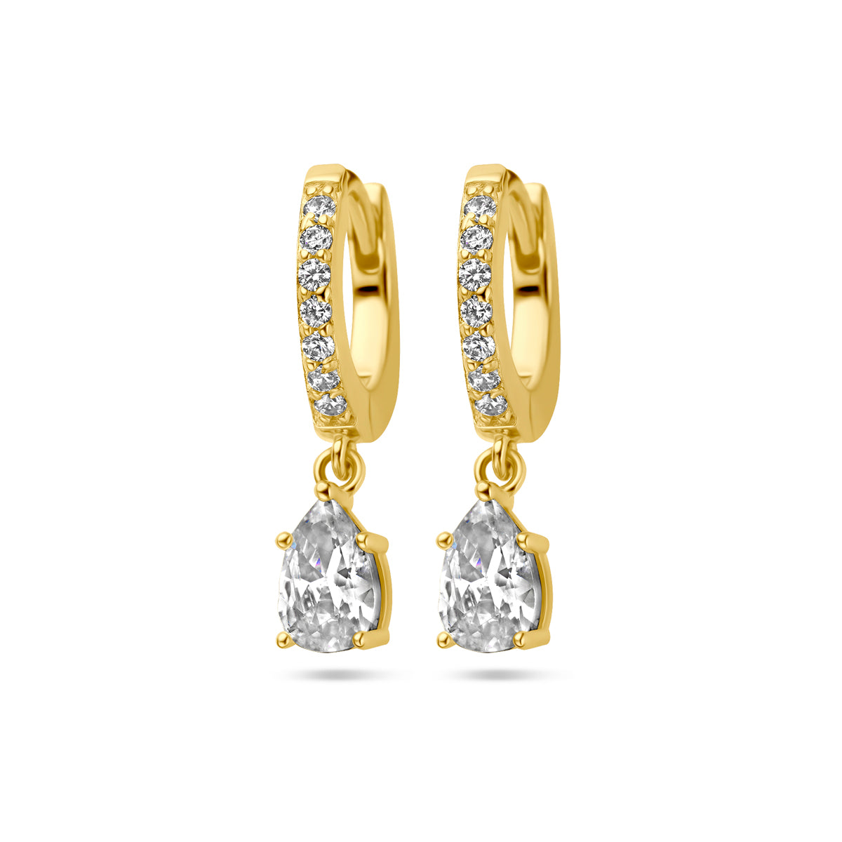 Verguld op 925 zilveren klapoorringen uitgevoerd met zirkonia. De oorringen hebben een totale hoogte van 20mm. Geen garantie op plating.