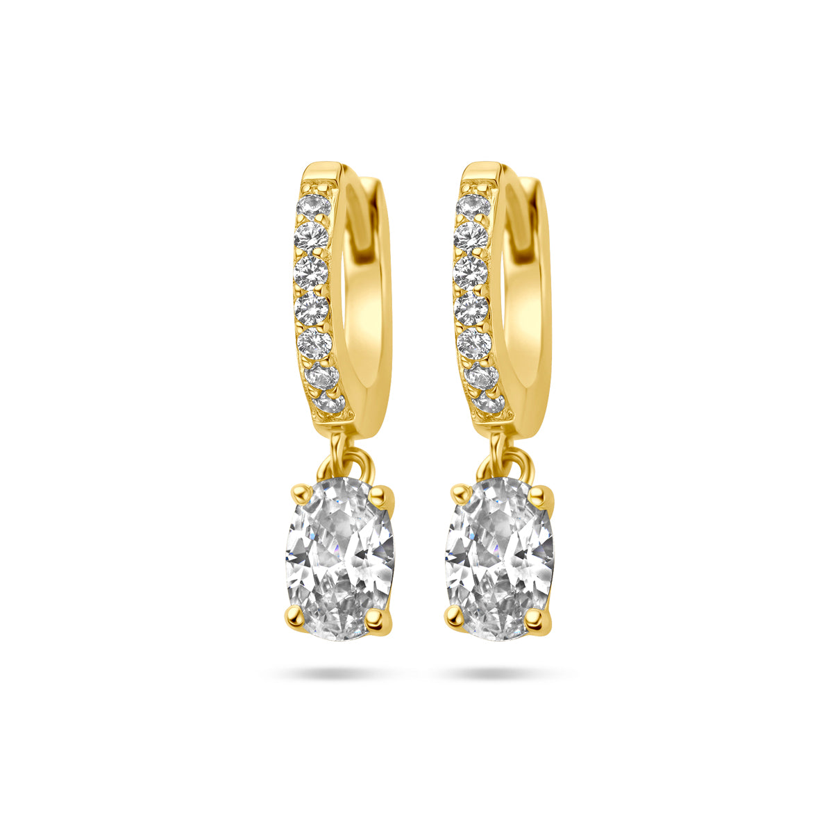 Verguld op 925 zilveren klapoorringen uitgevoerd met zirkonia. De oorringen hebben een totale hoogte van 17mm. Geen garantie op plating.