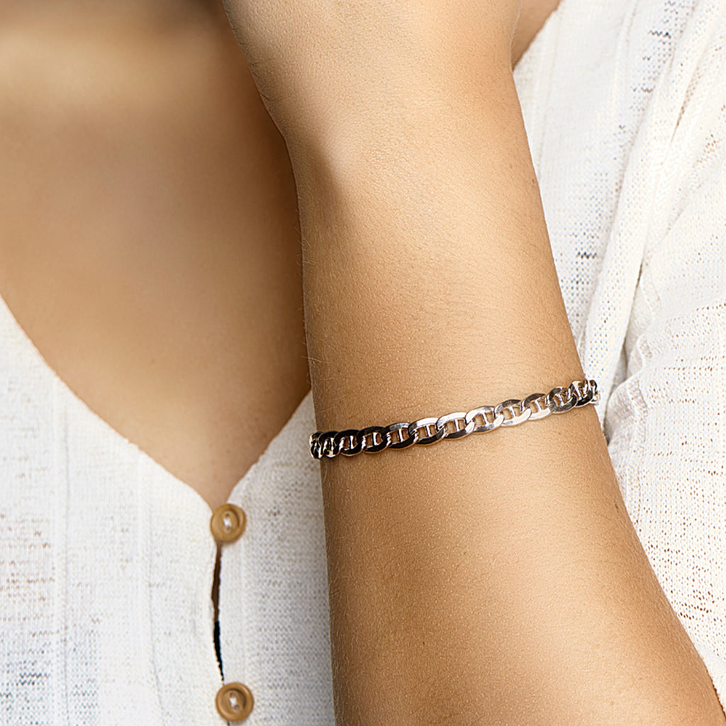 Gerhodineerd zilveren lengte artikel met een stijlvol ontworpen anker schakel. Het lengte artikel heeft een schakelbreedte van 6.5mm. Uitgevoerd met een stevige karabijn sluiting. Info: Gerhodineerd zilver is door de rhodiumlaag beter bestand tegen verkleuren en krassen.