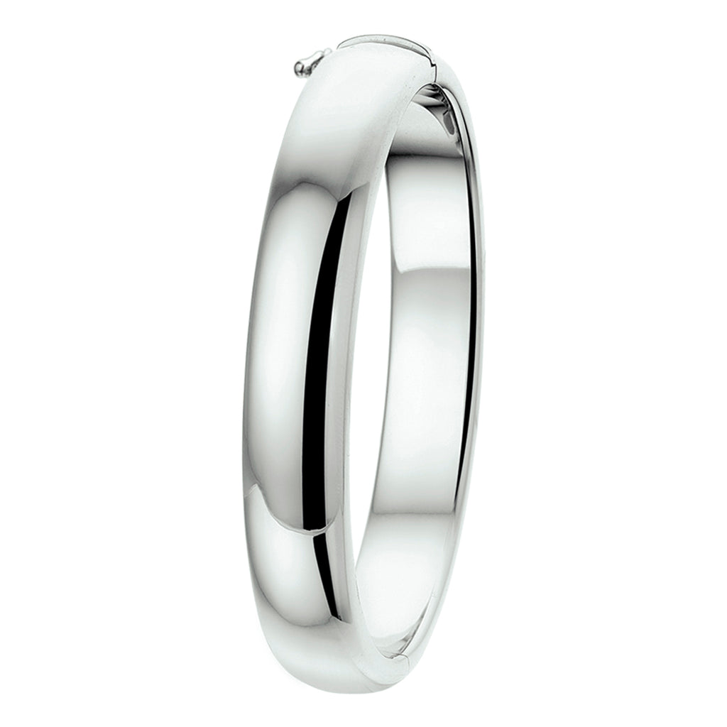 Gerhodineerd zilveren bangle met ovale buis en een scharnier-sluiting.