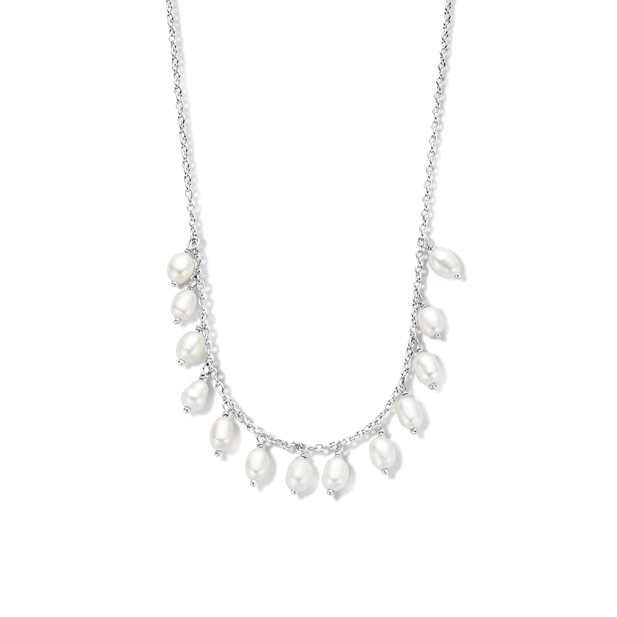 Gerhodineerd 925 zilveren collier uitgevoerd met zoetwaterparels en een karabijnsluiting. Het collier heeft een schakelbreedte van 1.2mm en een draaglengte van 40cm met 4cm extensie.