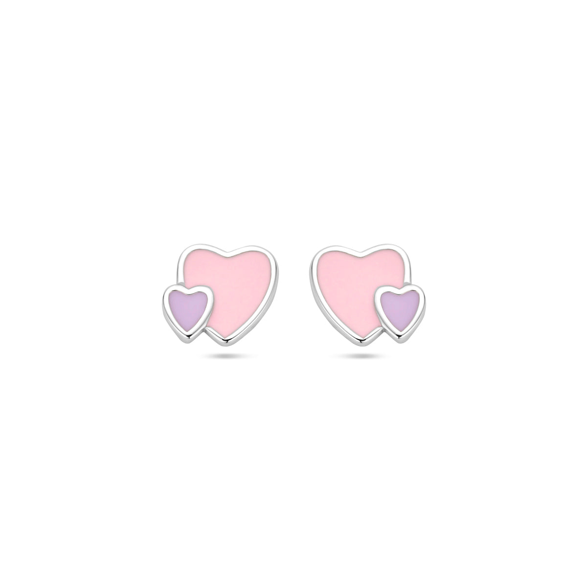 Gerhodineerd 925 zilveren oorknoppen uitgevoerd met twee harten, met roze en paars emaille. De oorknoppen hebben een afmeting van 8x8mm.