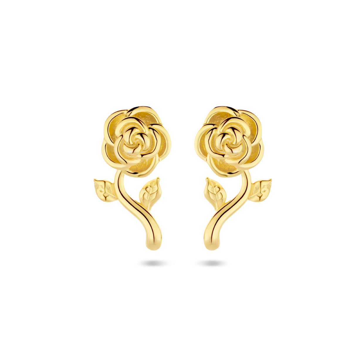 Geelgoud op 925 zilveren oorknoppen uitgevoerd in de vorm van een roos. De oorknoppen hebben een afmeting van 12.5x5.5mm. Geen garantie op plating.