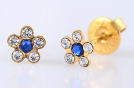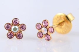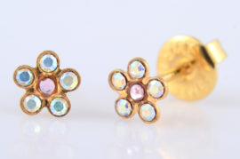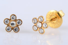 Chirurgisch stalen schietoorbellen M/K bloem met goudkleurige zetting. De oorbellen hebben een diameter van 4 mm.