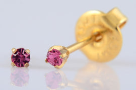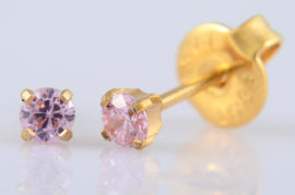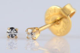 Chirurgisch stalen schietoorbellen met een auqamarine kleur steen. De steen word vastgehouden op vier punten met een goudkleurige zetting. De oorbellen hebben een diameter van 2 mm.