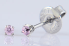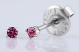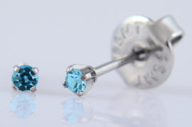 Chirurgisch stalen schietoorbellen met een auqamarine kleur steen. De steen word vastgehouden op vier punten. De oorbellen hebben een diameter van 2 mm.